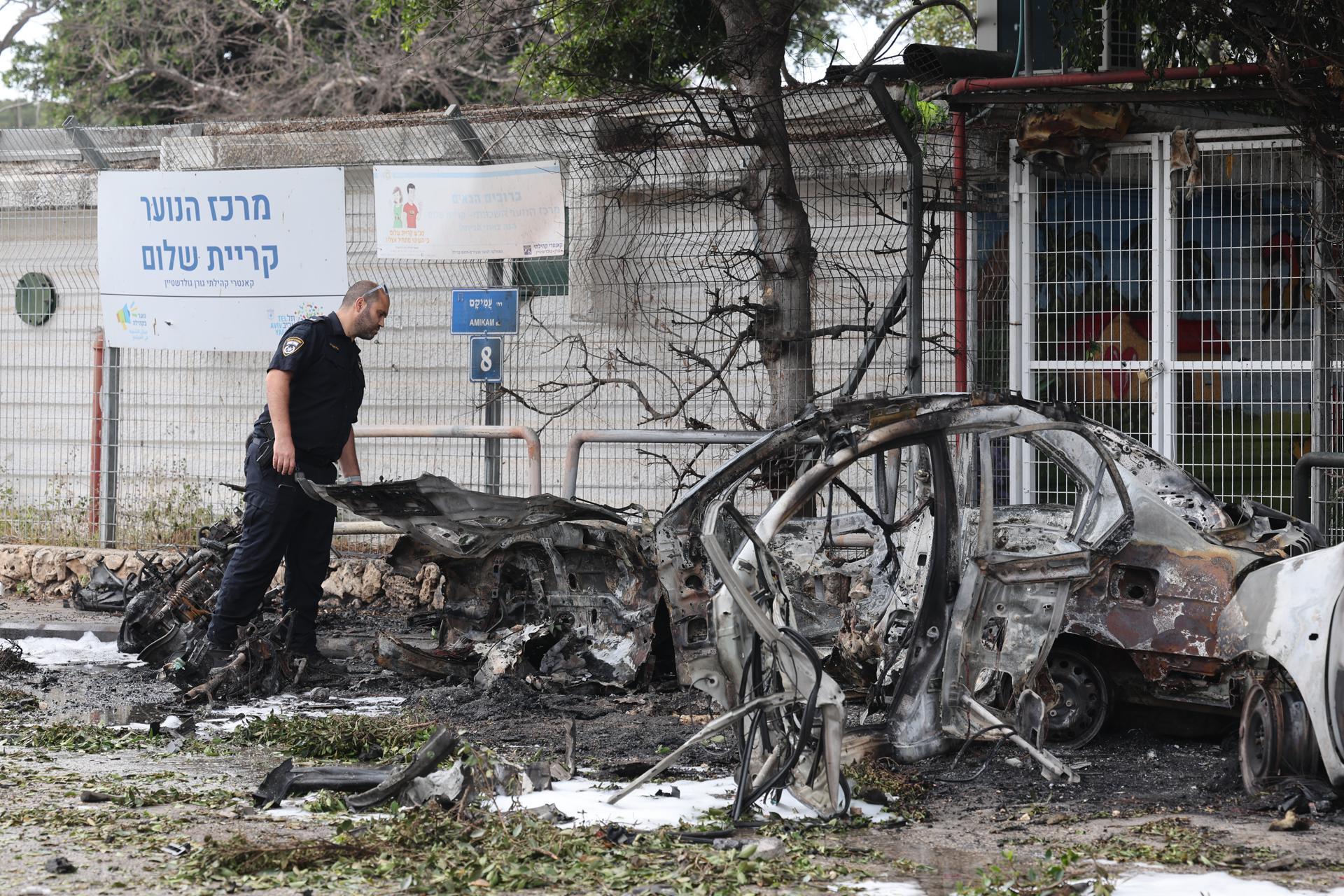 Un policía israelí inspecciona coches calcinados tras el impacto de fragmentos de un misil balístico iraní interceptado en Tel Aviv, Israel, el 15 de marzo de 2026. EFE/EPA/ABIR SULTAN
